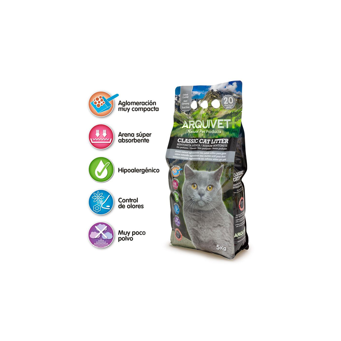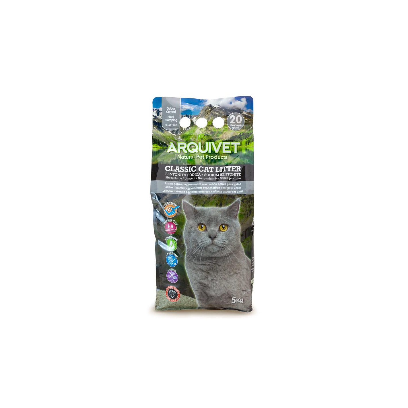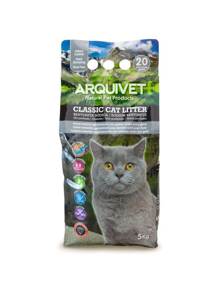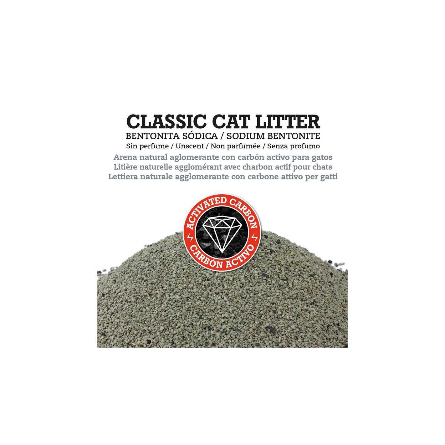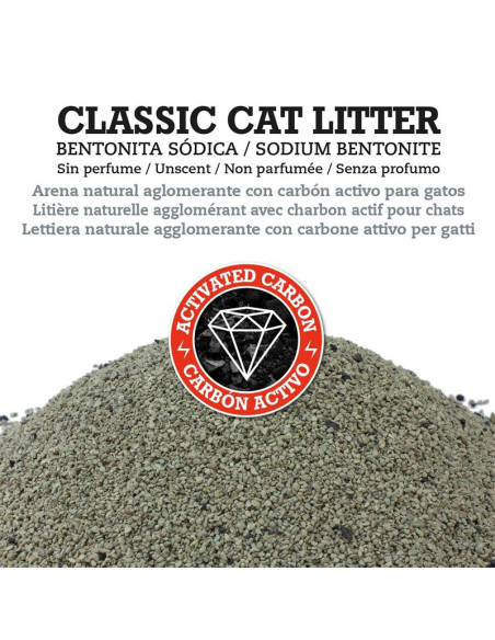 Arena natural aglomerante para gatos, enriquecida con carbón activo. De gran capacidad aglomerante, sin apenas polvo, poca adherencia a las patas del gato (evitando así que la arena se desperdigue por el piso) y con un muy buén control de los olores gracias al carbón activo.