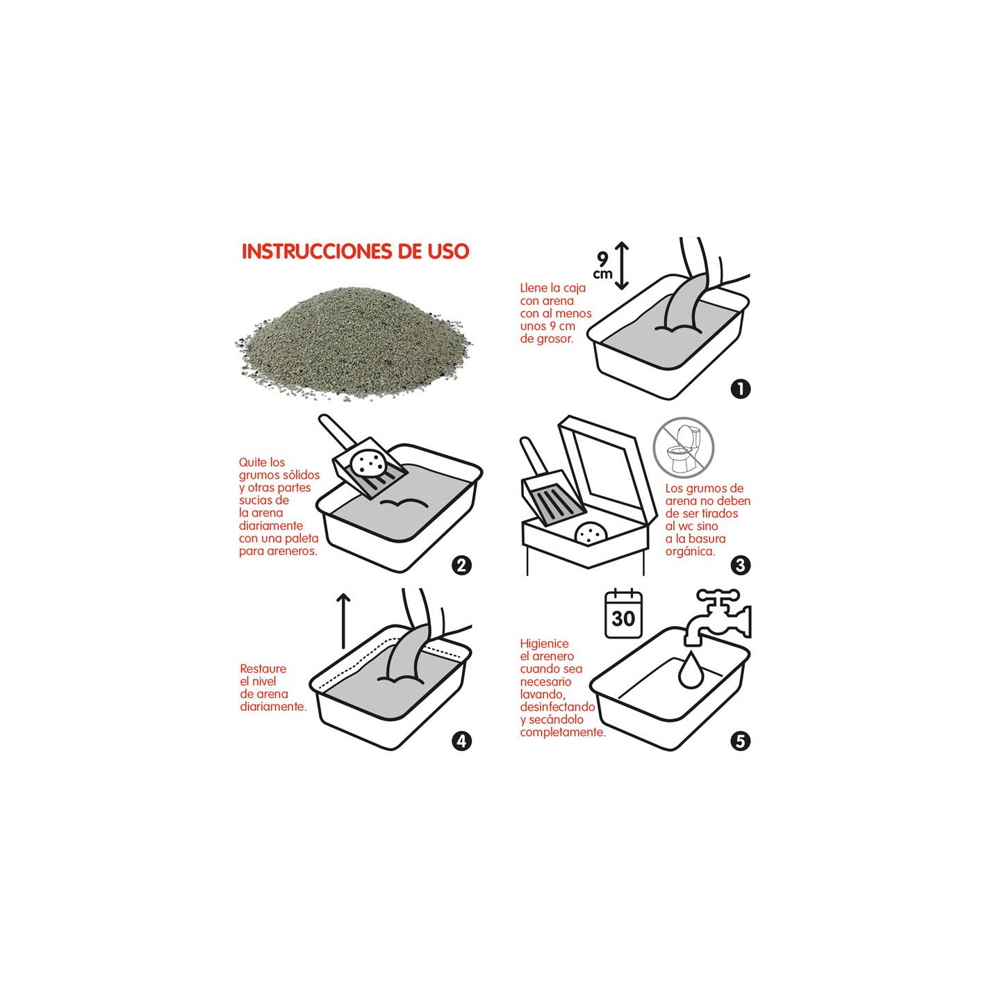 Instrucciones de uso: Llene la caja con arena con al menos unos 5-6 cm de grosor. Quite los grumos sólidos y otras partes sucias de la arena diariamente con una paleta para areneros. Restaure el nivel de arena diariamente. Higienice el arenero cuando sea necesario lavando, desinfectando y secándolo completamente. No olvide que los gatos son animales obsesionados con la limpieza.