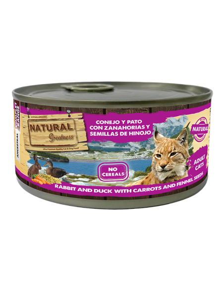 Esta receta para gatos adultos contiene una mezcla de carnes de conejo y pato altamente saludables. Las zanahorias son ricas en betacaroteno, con vitaminas A, C y K. Presentan altos niveles en potasio y fibra. Sus propiedades ayudan a mejorar la salud de la piel y la vista. Las semillas de hinojo son muy digestivas por lo que su inclusión en este alimento ayuda a mejorar la salud gastrointestinal del gato.