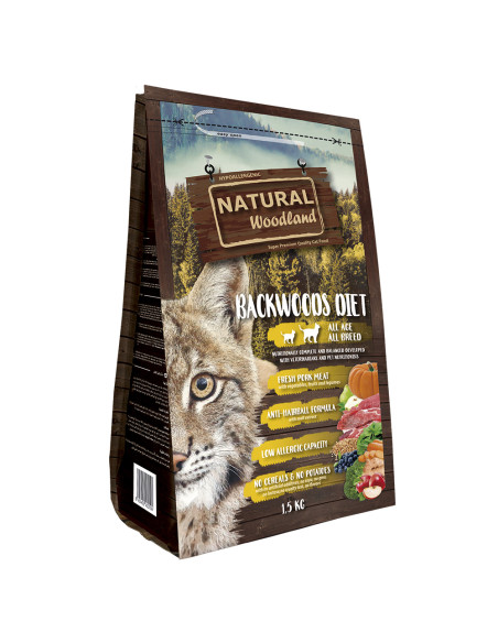 Backwoods Diet es un excelente alimento hipoalergénico formulado para gatos de todas las razas y edades y elaborado con carne fresca y deshidratada de cerdo ibérico, una carne muy sabrosa, de elevado valor nutricional e ideal para una dieta monoproteica, sana y natural. Esta receta no contiene cereales ni patata, por lo que está indicada para aquellos gatos con alergia o intolerancia a dichos alimentos. Entre sus ingredientes naturales destacan las frutas y las verduras, como la pera, la manzana, los arándanos, la zanahoria, el brócoli, la calabaza, las espinacas y el jengibre, las cuales aportan multitud de beneficios para la salud de los gatos. Además, su proporción de ácidos grasos omega 6 y omega 3 ayuda a mantener un equilibrio lipídico adecuado, lo que se traduce en una piel sana y un pelo brillante.