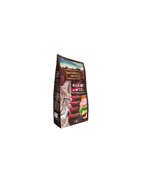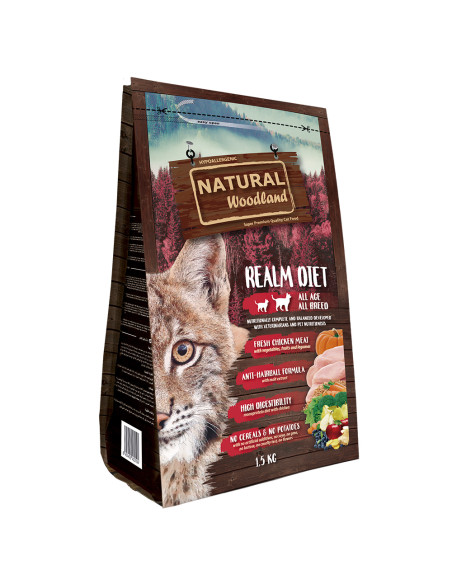 Realm Diet es un excelente alimento hipoalergénico formulado para gatos de todas las razas y edades y elaborado con carne fresca y deshidratada de pollo, una carne baja en grasa y de elevado valor nutricional, ideal para llevar una dieta sana y natural. Esta receta no contiene cereales ni patata, por lo que está indicada para aquellos gatos con alergia o intolerancia a dichos alimentos. Entre sus ingredientes naturales destacan las frutas y las verduras, como la pera, la manzana, los arándanos, la zanahoria, el brócoli, la calabaza, las espinacas y el jengibre, las cuales aportan multitud de beneficios para la salud de los gatos. Además, su proporción de ácidos grasos omega 6 y omega 3 ayuda a mantener un equilibrio lipídico adecuado, lo que se traduce en una piel sana y un pelo brillante. Toda nuestra alimentación se elabora siguiendo un proceso natural de cocción altamente avanzado que se basa en la inyección directa de carne fresca. La calidad de los ingredientes naturales empleados en nuestras recetas les aporta altos niveles de palatabilidad y digestibilidad.