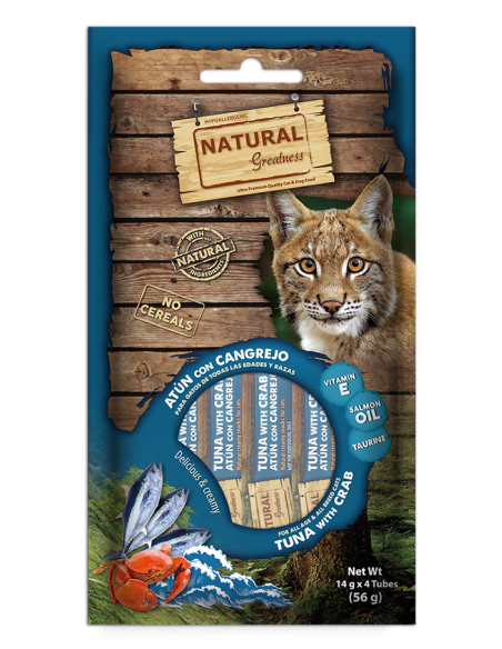 Natural Greatness Crema de atún con cangrejo es un suave y cremoso snack elaborado sin cereales que incluye atún y cangrejo de primera calidad y está enriquecido con taurina, vitamina E y aceite de salmón para ayudar a que el gato mantenga una piel saludable y un pelaje sedoso y brillante.
