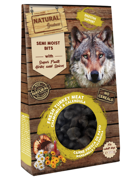 Bits semihúmedos naturales, hipoalergénicos y sin cereales aptos para administrar como premio o recompensa a perros adultos. Además de la carne de pavo de alta calidad como principal ingrediente cárnico, este snack incorpora manzanilla y caléndula, dos ingredientes con muy beneficiosos para el sistema digestivo del perro