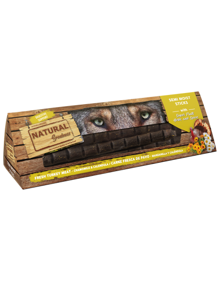 Sticks semihúmedos Natural Greatness con carne fresca de pavo, manzanilla y caléndula. Digestive Support